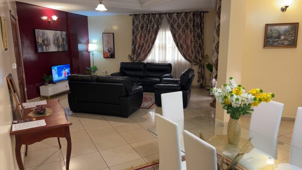La belle et grande terrasse meublée, accessible depuis le salon ou la chambre, est une invitation à la relaxation et au farniente, avec une vue imprenable sur la ville de Yaoundé et ses collines verdoyantes, comme ci-dessous, avec une vue au lointain sur le Palais présidentiel d’Etoudi…